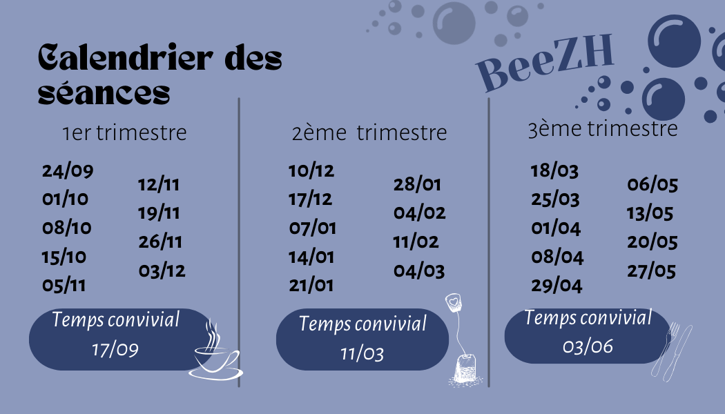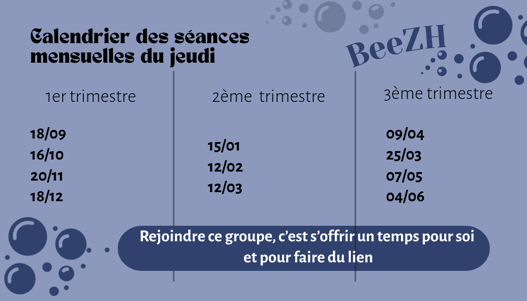 Afin de promouvoir une approche globale du bien-être, BeeZH propose actuellement des ateliers de Sophrologie avec Sandrine Marousé (06 16 18 12 49), le mercredi de 10h à 11h30 à la maison des associations à côté de Grain de Sel à Séné - Ligne 7 arrêt Penhoët - inscriptions : à l'année, tous les 15 jours ou à la séance. Calendrier ci-dessous