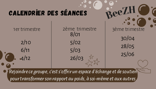 Pour soutenir les personnes qui souhaitent perdre du poids, BeeZH propose actuellement des séances de partage et Sophrologie avec Sandrine Marousé (06 16 18 12 49). Les séances ont lieu un fois par mois le jeudi de 18h à 19h à la salle des fêtes place Coffornic à Séné.